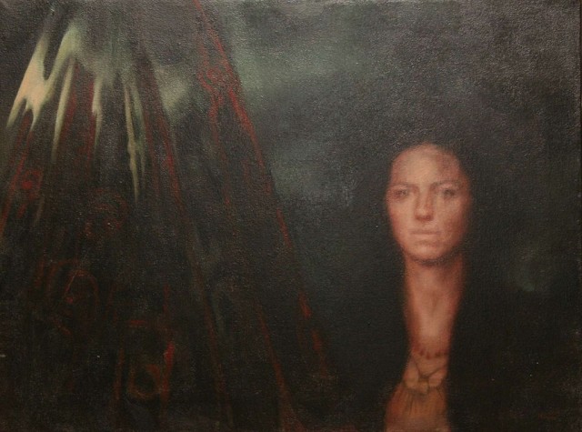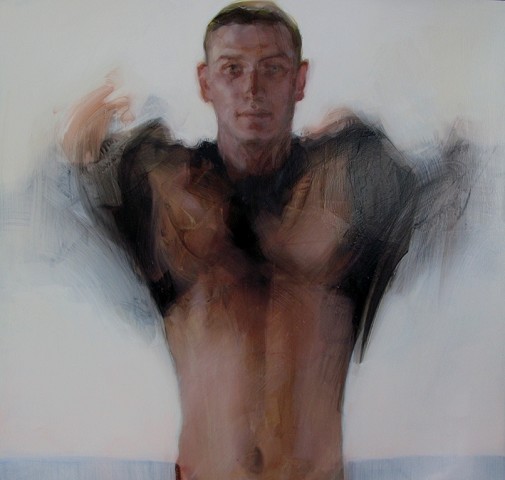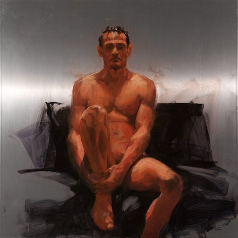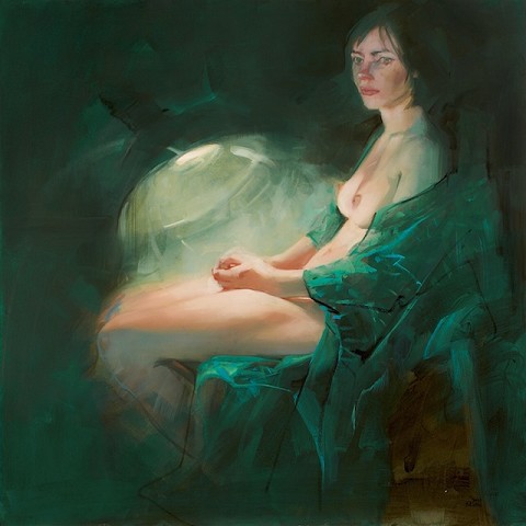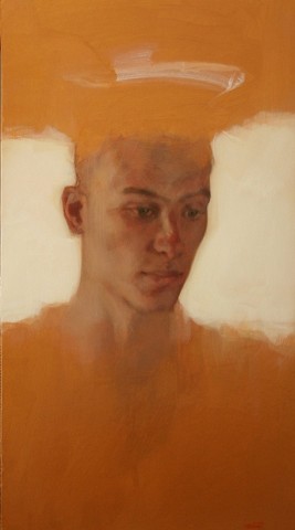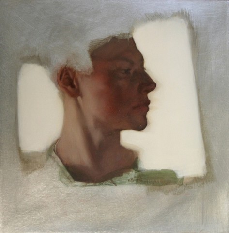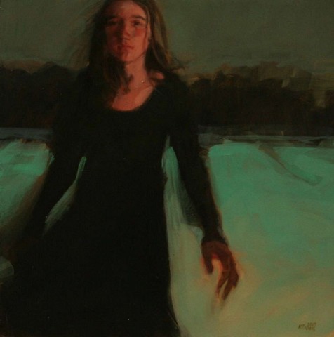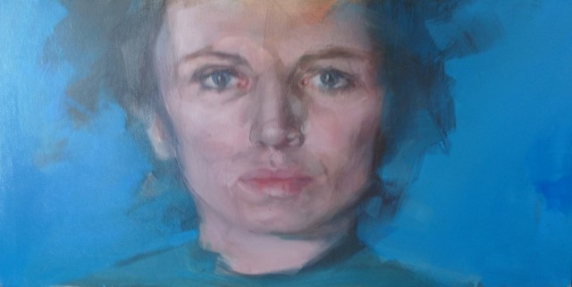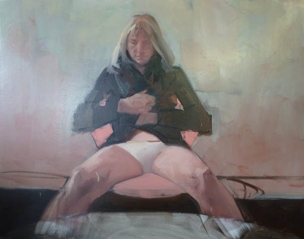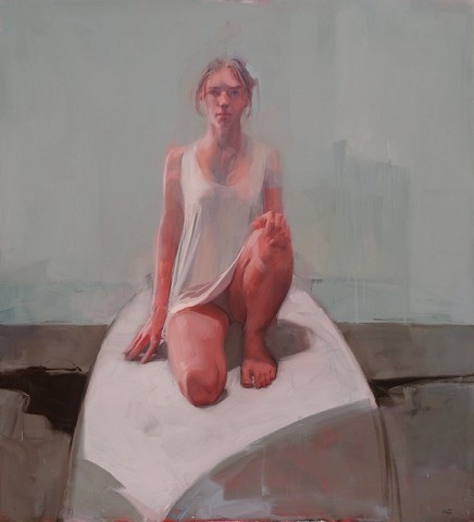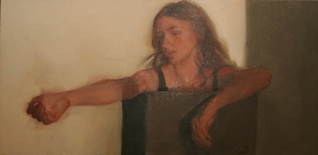 Evans’ depicts her singular pensive forms against a stark background, usually devoid of contextual references. In this sense her works remind one of the paintings of Stephen Conroy, the Scottish contemporary realist painter. But while Evans’ paintings begin as surface verisimilitude, they