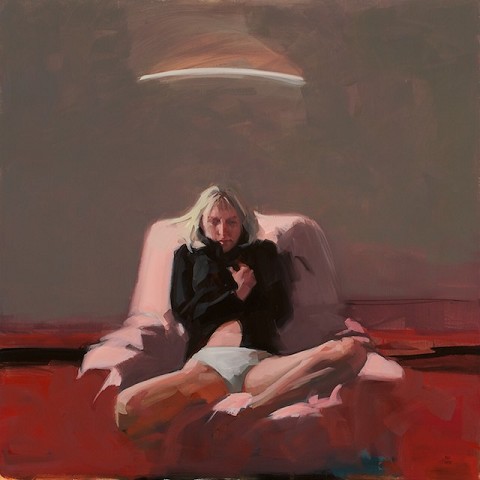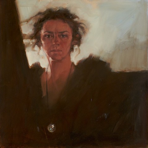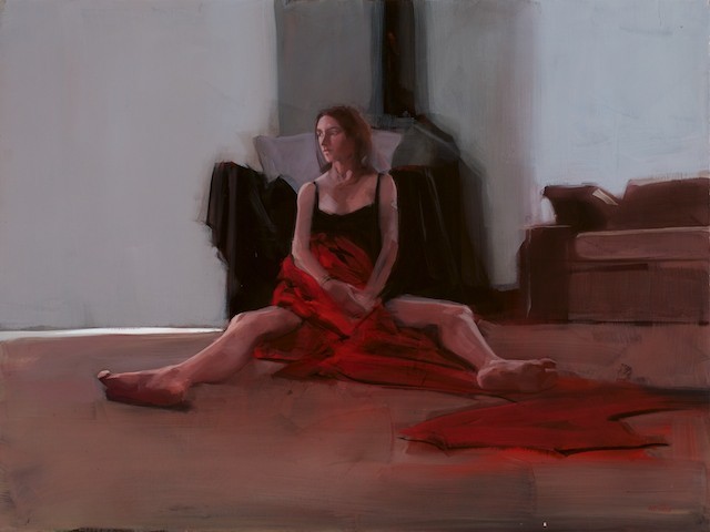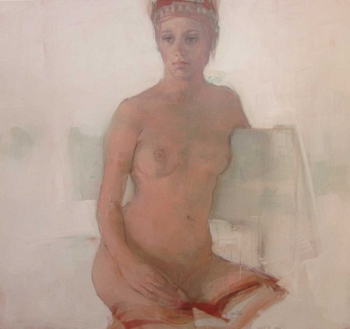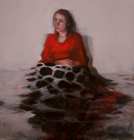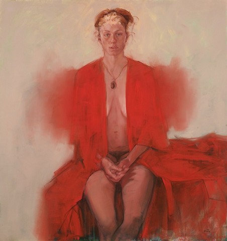 loose brushstroke and unpredictable palette. For example, in one of the paintings she depicts Fiona in a loosely draped cadmium red robe. The emotive intensity of the red need not provoke a symbolic association but could simply suggest, more viscerally, flesh and blood. And, from the focal point of