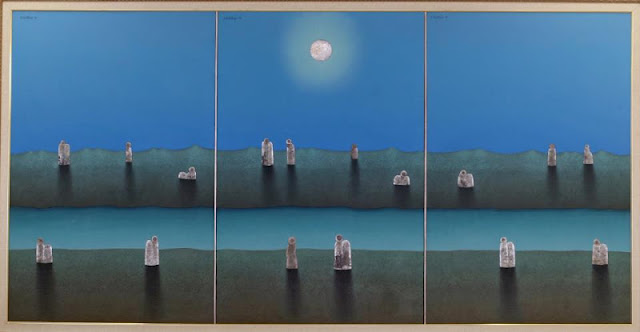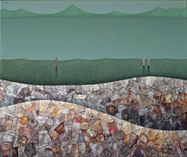 Smashed shiny cans contrast with the smooth surfaces of the tabletops. The wrinkled commercial objects are adornments on masked men or fit between abstract landscape layers. The brilliant sun is a discarded lid and the moon is manipulated metal. A hand, ink and pen unite in their difference, all contrived of recycled industrial materials.