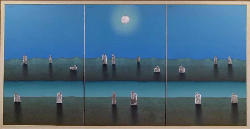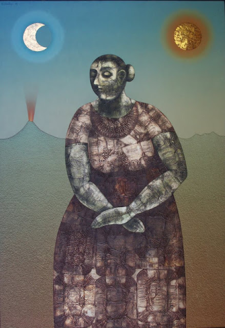 Ar贸stegui works in series. One series was the human body, whole and separate, sometimes like cuts of meat on a table. In 1974, he painted the petro glyphs of pre-Hispanic cultures and then the ceramics of his country. Currently, working in his studio in Managua, he creates the lake and volcano landscapes. He is an energetic and gracious host. The long white studio is clean and inviting; the piles of recyclables are organized. Alejandro’s private collection symbolizes a complete representation of work and growth. He uses strange materials (sand, cans, bones, textiles) and he adheres them to the canvas with glues, varnishes, cement and asphalt. The predominant colors are monochromatic in the background and metallic finishes darken the rubbed and veiled areas. Sometimes he uses a pure white against a dirty black, fire red, sienna and ochre, the limited spectrum of colors used in pre-Columbian potteries. Other times blue, green and gray create the backdrop for the metallic illuminations.