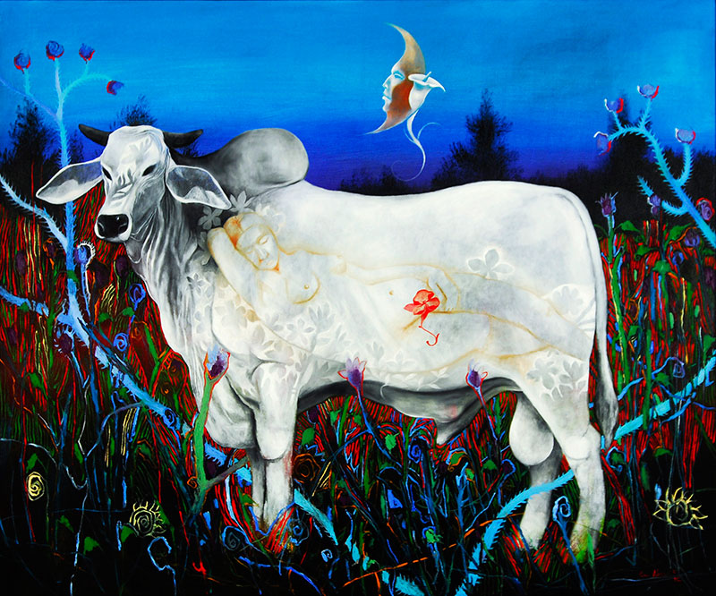 "I am from a small village - El Manantial, Coahuila - just outside Torreon, Mexico, and came to the U.S. as a shy seven year old. In the eleven years that I have been painting professionally, I have come to realize that my work is defined both by my familial roots in northern Mexico and by the subtle, mystical environment of my adopted home in West Texas. My creative process is immersed in this dual identity; I paint what I feel, that which is me. You will see on canvas the richness of my grandparents' folk tales alongside the adventures of the 'new life' created by my hardworking immigrant parents. Through symbolism, metaphors, and pictorial language, I tell my story."