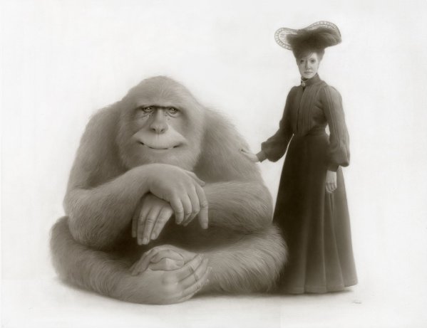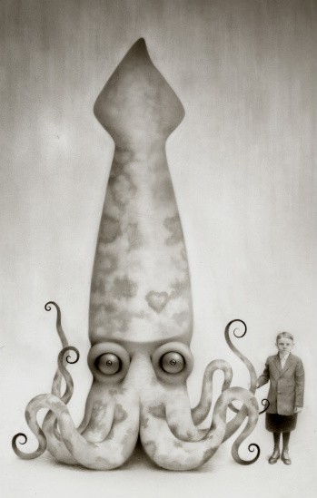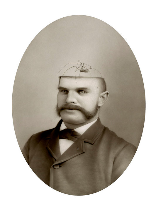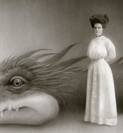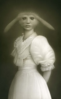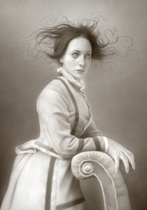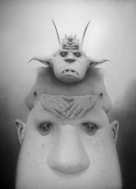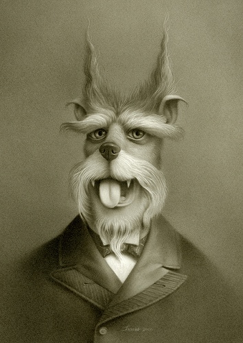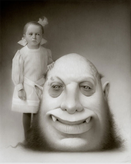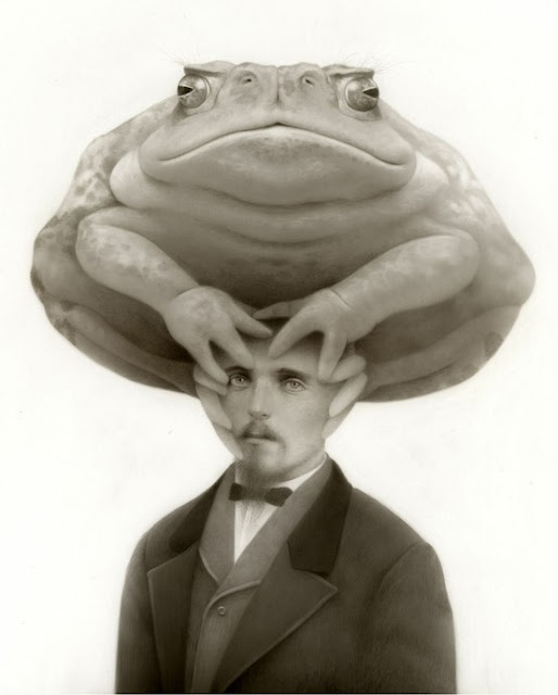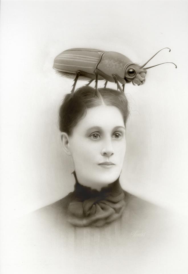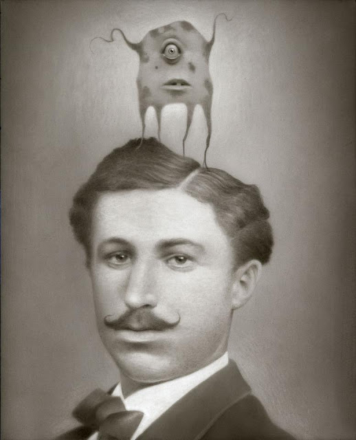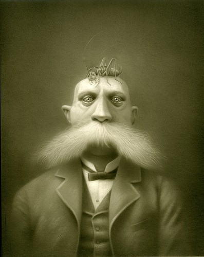 Travis Louie’s paintings come from the tiny little drawings and many writings in his journals. He’s created his own imaginary world that is grounded in Victorian and Edwardian times. It is inhabited by human oddities, mythical beings, and otherworldly characters who appear to have had their formal portraits taken to mark their existence and place in society. The underlining thread that connects all these characters is the unusual circumstances that shape who they were and how they lived. Some of their origins are a complete mystery while others are hinted at. A man is cursed by a goat, a strange furry being is discovered sleeping in a hedge, an engine driver can’t seem to stop vibrating in his sleep, a man overcomes his phobia of spiders, etc, . . .Using inventive techniques of painting with acrylic washes and simple textures on smooth boards, he’s created portraits from an alternate universe that seemingly may or may not have existed.