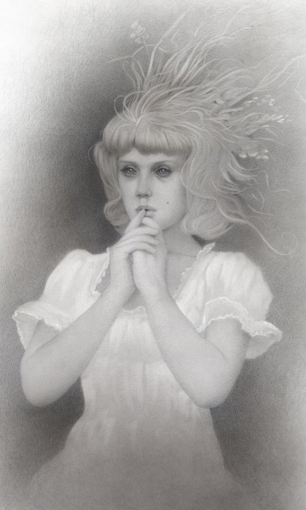 To achieve the dramatic “mood” in his paintings, they are produced primarily in black and white or limited color. He uses acrylic paints over tight graphite drawings on smooth grounds, like “plate” finish illustration board or finely sanded, primed wood panels. When he is not painting, his time is spent writing in his notebooks and journals. Many little drawings and sketches are made from those writings, most of which are less than 10 centimeters square.
