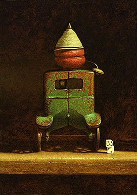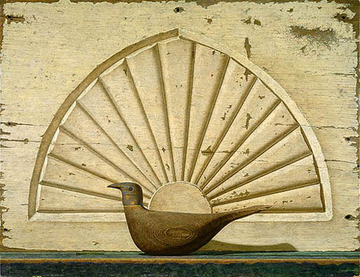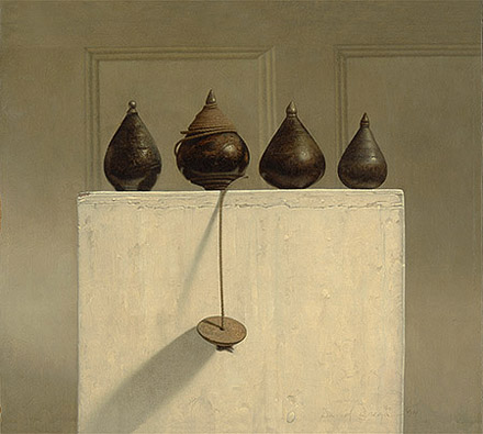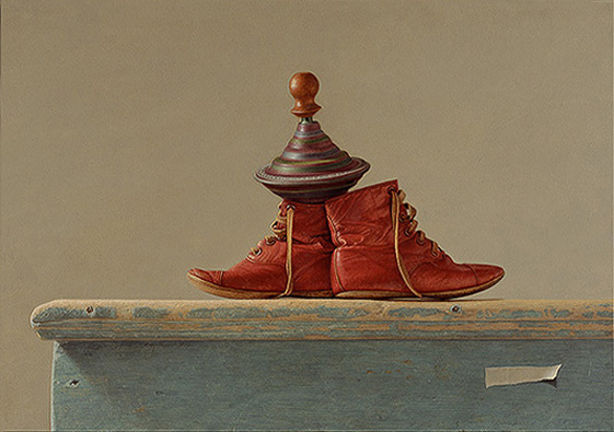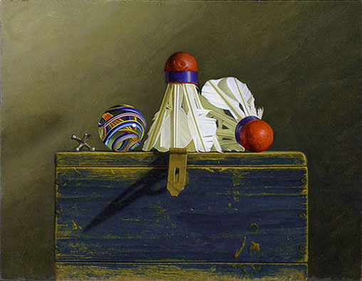 "David Brega is recognized today as one of the country’s foremost contemporary painters of still life. The hallmarks of his style are a taste for spare compositions that are structured from a simple yet powerful design sense, combined with visual richness of surface detail. At the same time he chooses subject matter—old painted woods, antique toys, letters, and pictures from the 19 th century—that conjures memories and nostalgia for days gone by. Brega has carved out a specialty in trompe l’oeil painting with his superb technique, exacting sense of design, and delight in playing tricks upon his viewers.