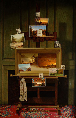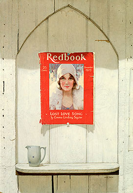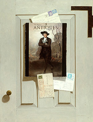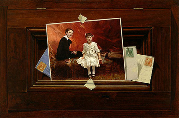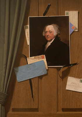 Brega’s paintings are classical in form; a bowl containing apples and a wooden bucket filled with eggs both hearken back to simple, frontal, balanced compositions that have been used by still life artists throughout history. However, his trompe l’oeil compositions, which combine reproductions of iconic images with letters and personal memorabilia, are more complex in meaning and locate Brega within a post modern world. In Founding Father, for example, we contemplate tradition compositional elements—the drawn curtains and the letters—combined with an image of John Adams, an icon of American history. The image, which Brega tore from a museum catalogue, is also a reference to an icon of American art, Gilbert Stuart’s portrait of John Adams. Stuart’s portrait of John Adams represented in Founding Father is but a reproduction of that portrait. That is, it is a painting of a reproduction. It is a painting of a reproduction of a painting by a famous American of a famous American. Brega’s postmodern audience is thus challenged to contemplate the nature of art within context and layers of fine art and popular culture.