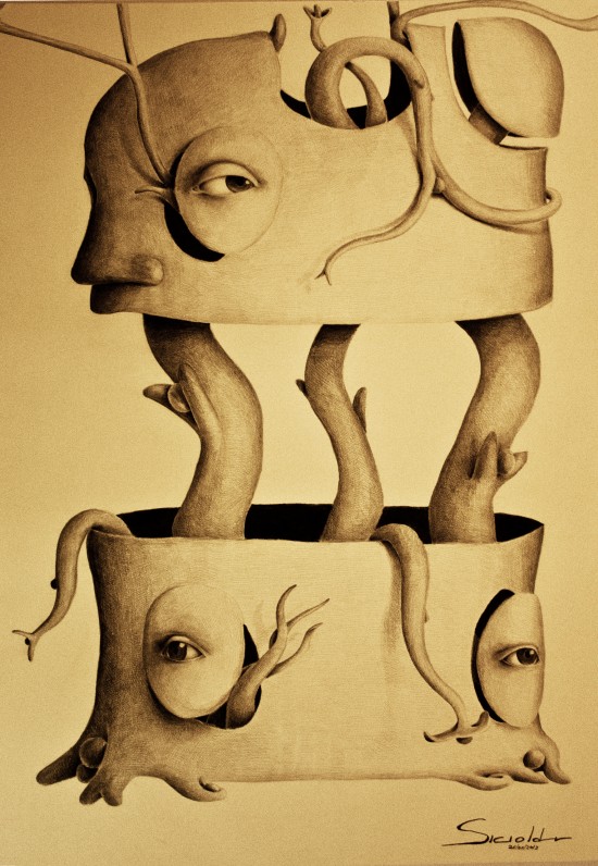 Sicioldr is an italian self-taught drawer born in 1990. His visionary style is influenced by the study of artists like Giraud, Bosch, Bruegel, Serafini, Seba and by his interests toward the relationship between alchemy and psychology. His uncanny subjects are images coming from the unconscious ,represented by the author through a rigorous and elegant style of drawing.