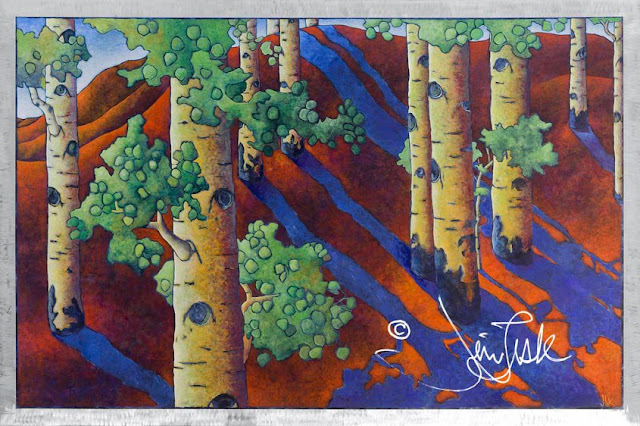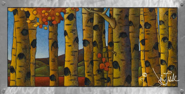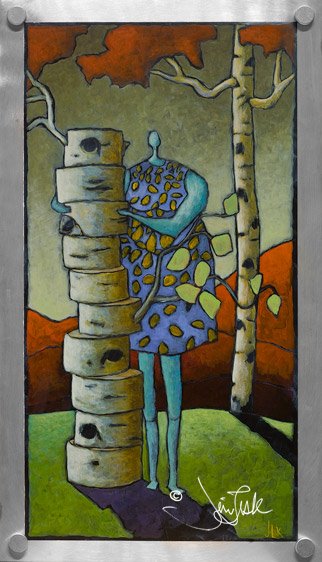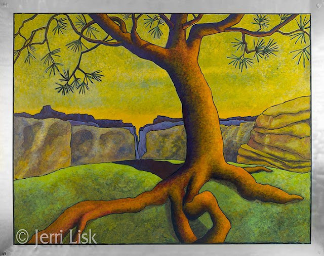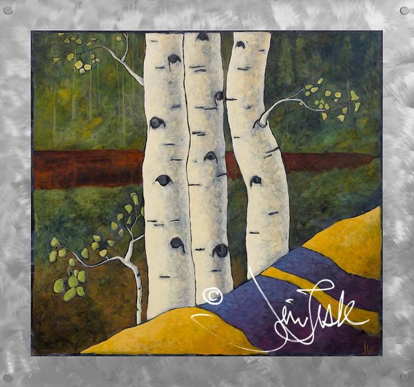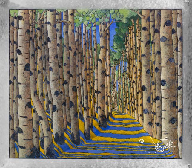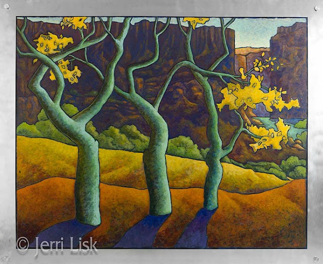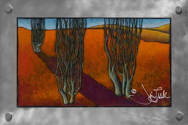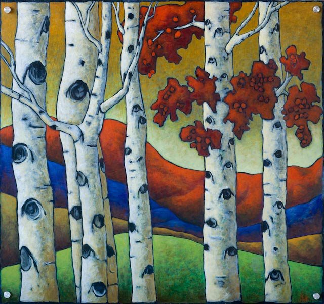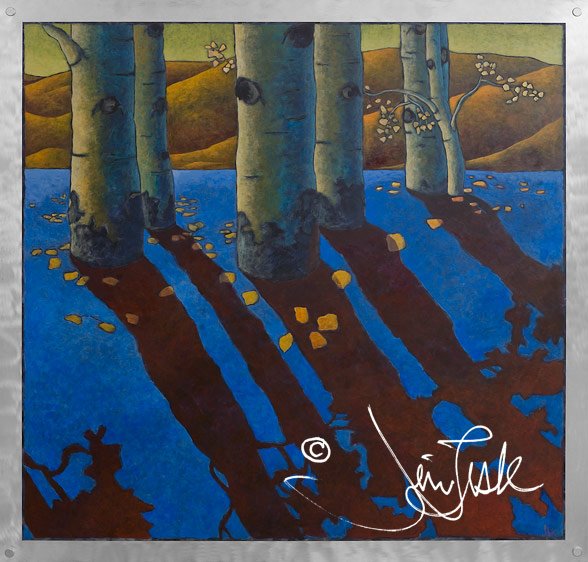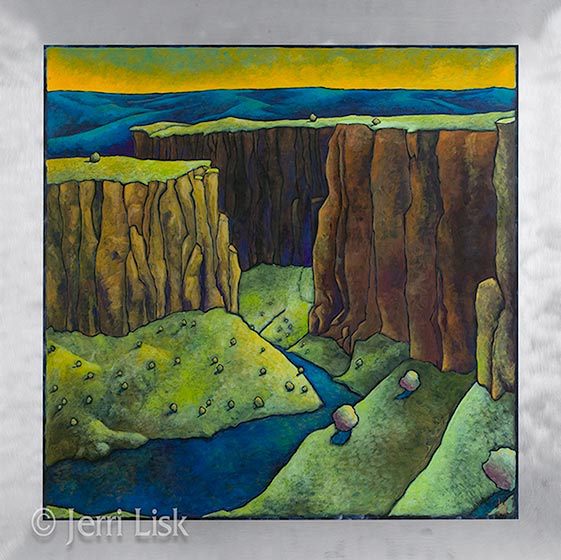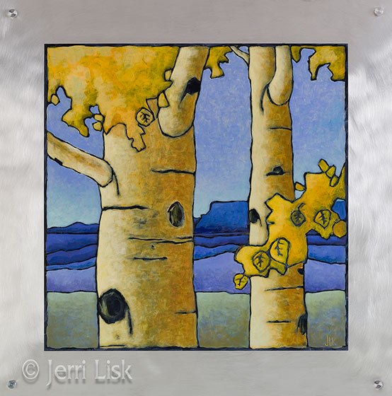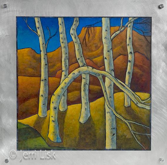 Artist Statement: I was born into a life of paint brushes, pencils and paper. With oceans, mountains and deserts in my veins, I use a rich palette of color; my eye ready to fasten the most impossible blue to a hillside or to find the strongest form to represent the shape of a tree. I studied as a student of painter Frank Holda, and later studied in London at the Leonard Pardon School of Specialty Design where I was taught techniques that whispered fluently the language of texture, material, surface and hue. From my home, I now set out into deserts, up craggy limber pine ridge-tops and down into river canyons, to capture in pen the stark forms of trees, hills and valleys into compositions. Later, I paint their lines, redrawing these simple lines onto the surface of metal, layering each with intense color and depth of light. While it is neither conceptual nor literal, there is something about the subject of the trees of which I never tire. It seems as though these forms each have a story to tell. I enjoy the one-on-one dimension that working on a large piece gives, as well as the small jewelry like accents of the small simple compositions. The installed painting stands away from the wall, but I hope to take future works towards a series of sculptural forms. –Jerri Lisk