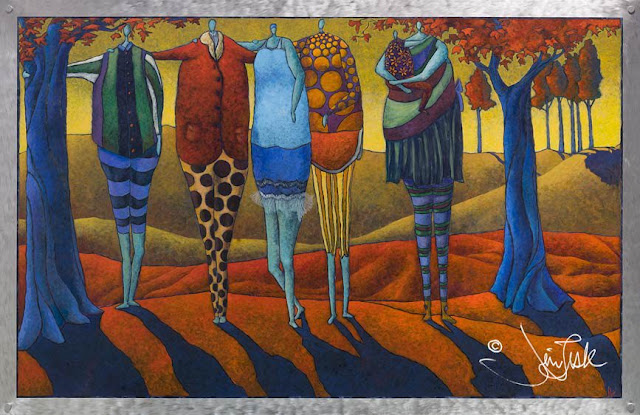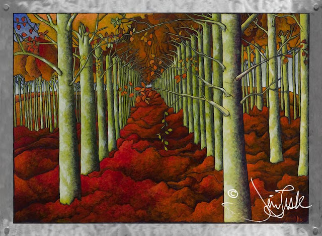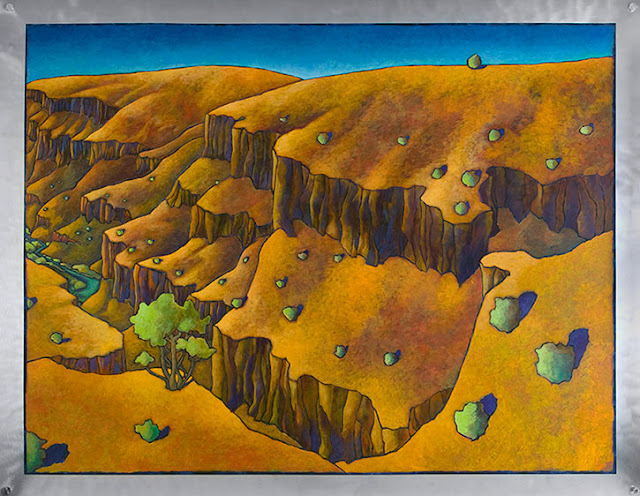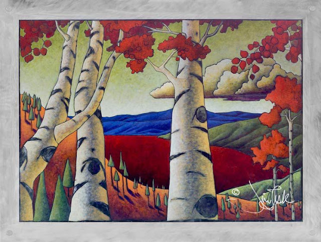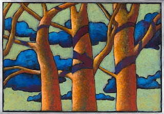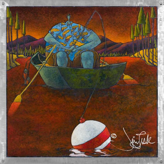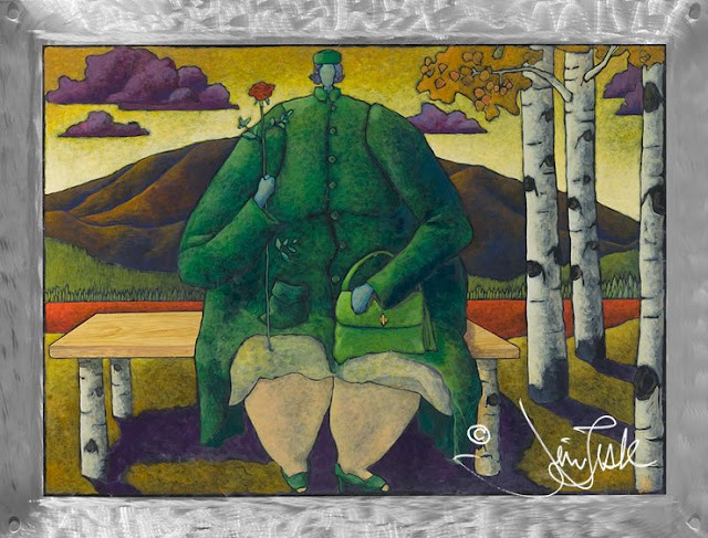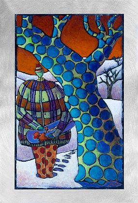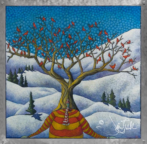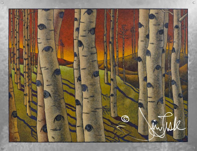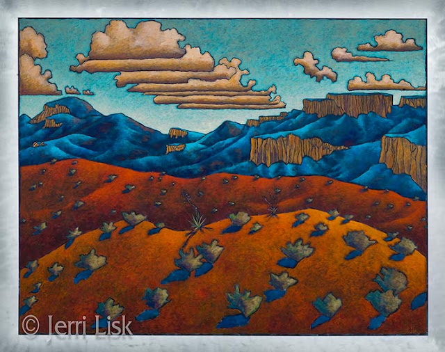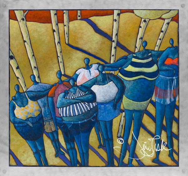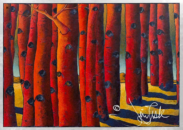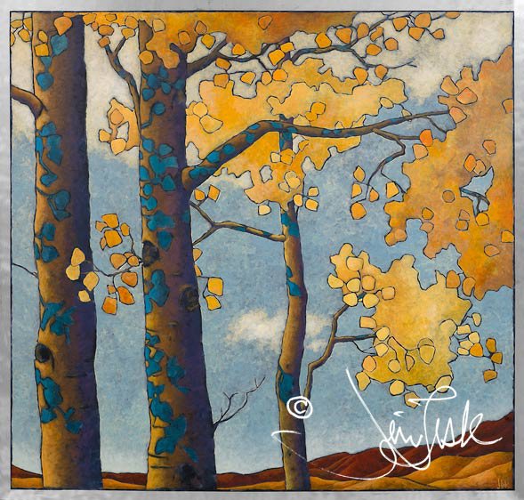 Artist Statement: I was born into a life of paint brushes, pencils and paper. With oceans, mountains and deserts in my veins, I use a rich palette of color; my eye ready to fasten the most impossible blue to a hillside or to find the strongest form to represent the shape of a tree. I studied as a student of painter Frank Holda, and later studied in London at the Leonard Pardon School of Specialty Design where I was taught techniques that whispered fluently the language of texture, material, surface and hue. From my home, I now set out into deserts, up craggy limber pine ridge-tops and down into river canyons, to capture in pen the stark forms of trees, hills and valleys into compositions. Later, I paint their lines, redrawing these simple lines onto the surface of metal, layering each with intense color and depth of light. While it is neither conceptual nor literal, there is something about the subject of the trees of which I never tire. It seems as though these forms each have a story to tell. I enjoy the one-on-one dimension that working on a large piece gives, as well as the small jewelry like accents of the small simple compositions. The installed painting stands away from the wall, but I hope to take future works towards a series of sculptural forms. –Jerri Lisk